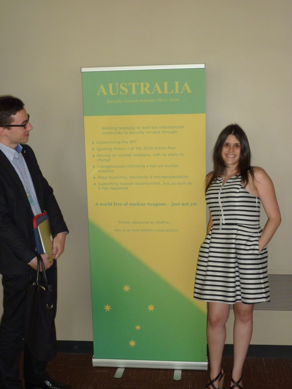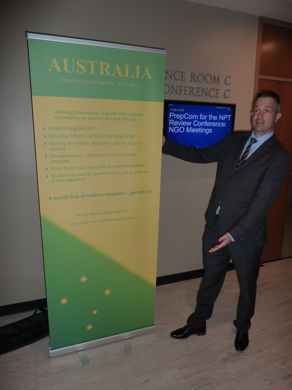 "We all share one thing in common: a desire to see the world eventually free of nuclear weapons" - Peter Woolcott, Australian statement 28 April. "Eventually" being the key word for Australia, a leading weasel state. We were delighted with this sentence, which might have been inspired by the Wildfire>_ Australia poster, which included the spoof tagline "A world free of nuclear weapons – just not yet". Life imitates art, as they say.